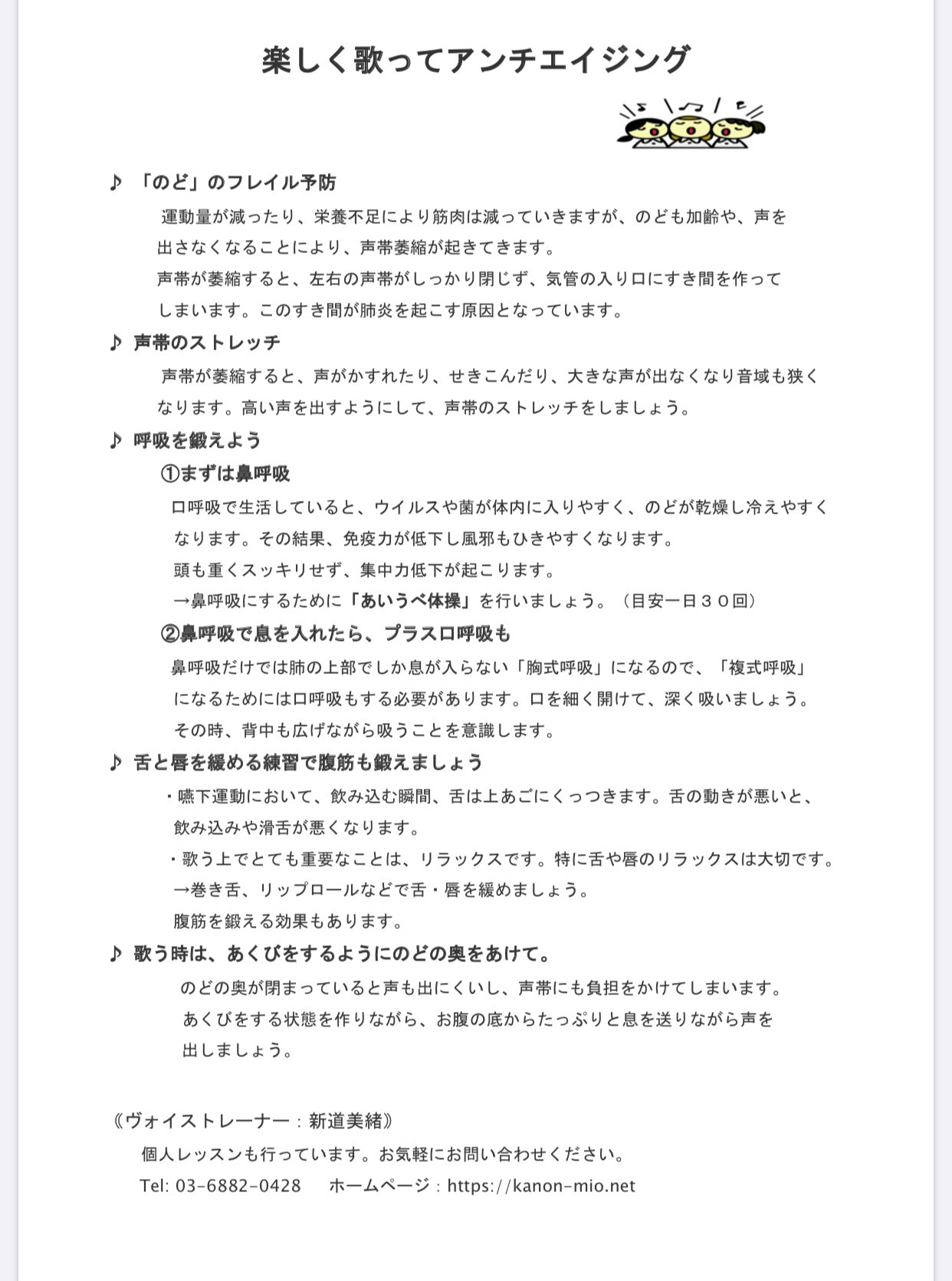 1時間半で「のどのフレイル予防」「身体を楽器にするための体操」「呼吸法」「発声のポイント」などを声を出しながら行い、その後リクエストいただいた曲を5曲、皆さんで歌い、最後には1曲ソロで歌い・・・と盛りだくさん。