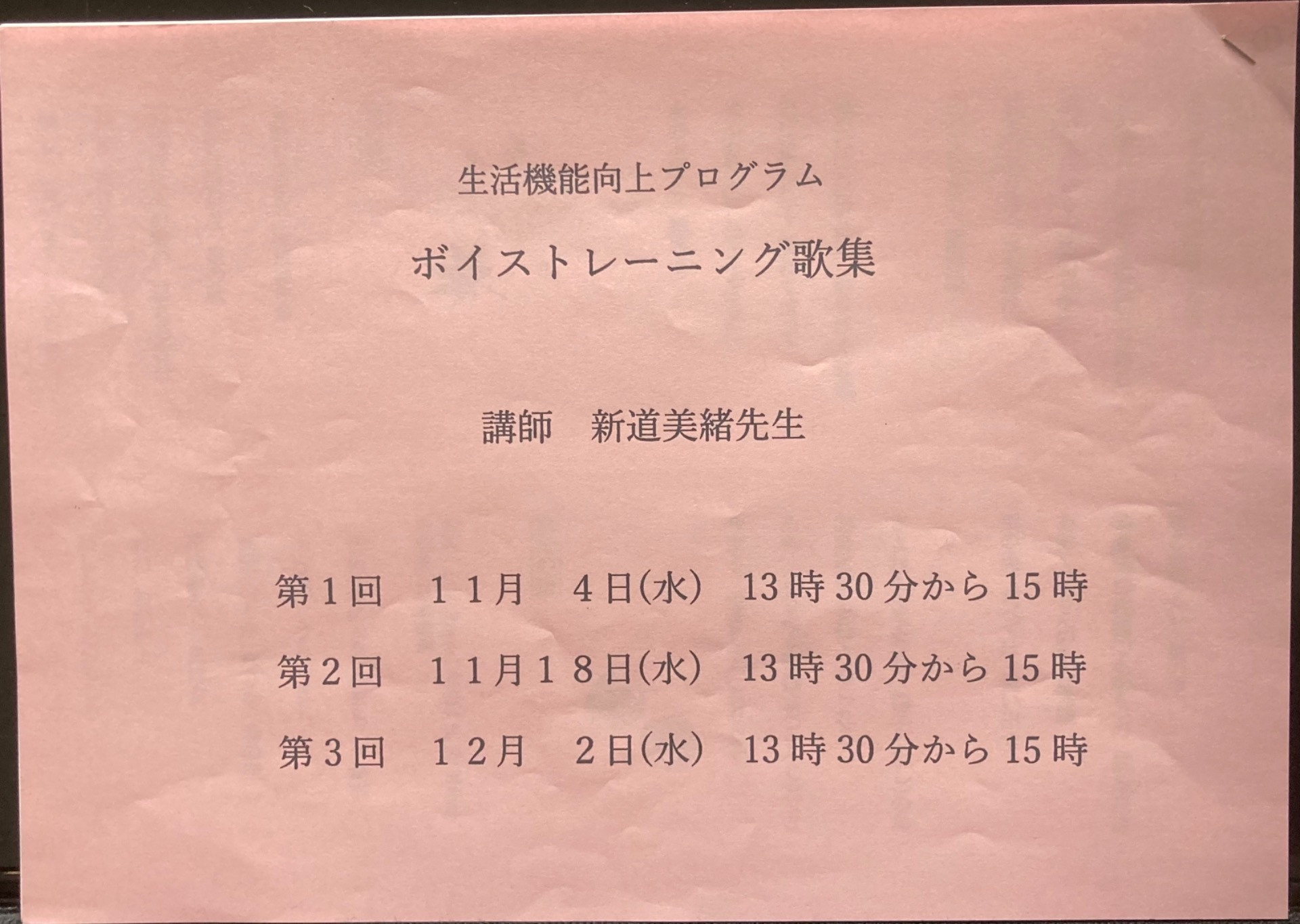 昨年に引き続き今年も呼んでいただいた、中野区上高田高齢者会館での介護予防歌のレッスン。昨年、一昨年は単発だったのに、今年は3回連続、同じメンバーで行うという。