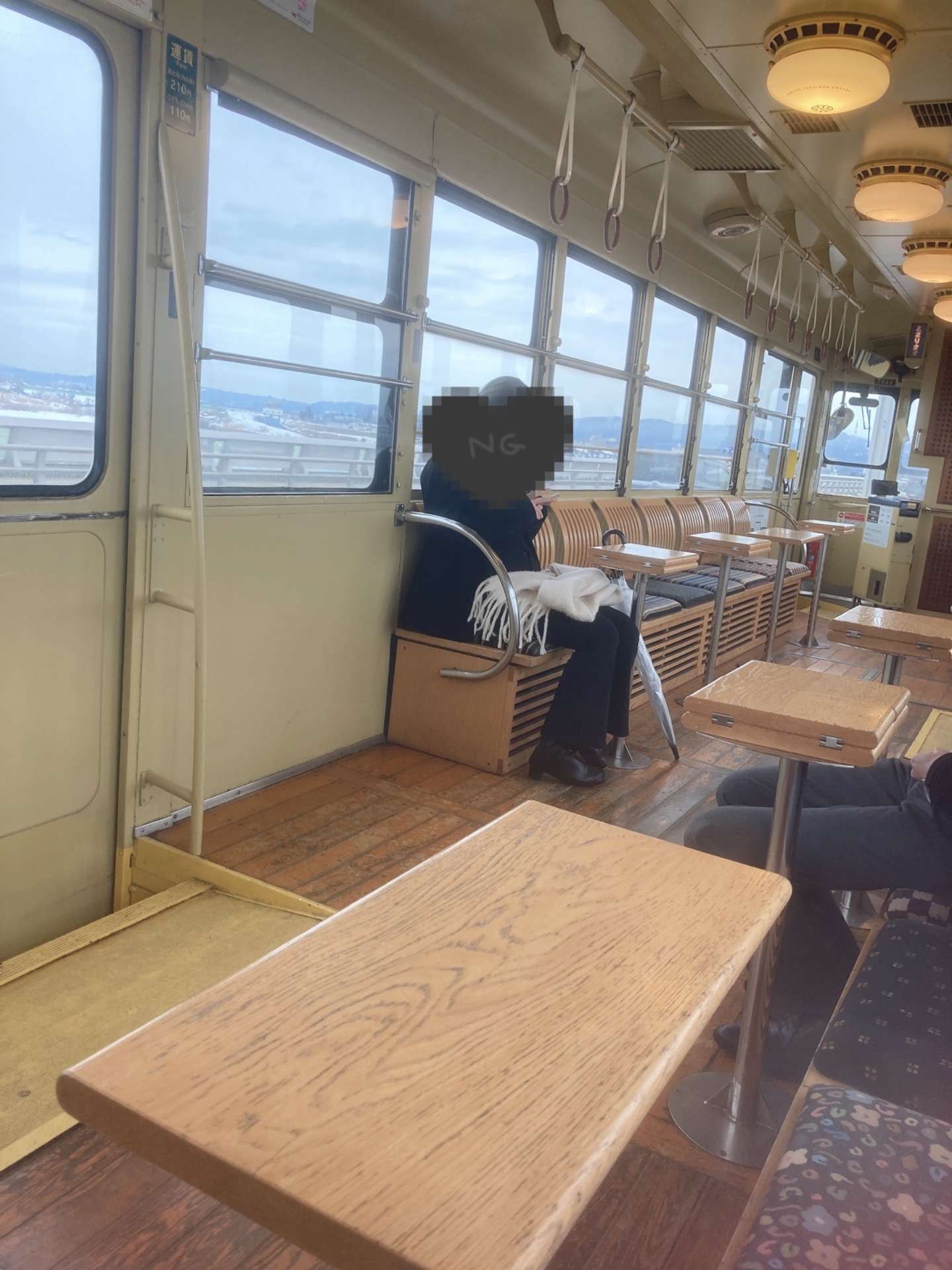 富山の路面電車 2022/02/10 富山の実家に来ています。 昨日来た時には全然雪が積もっていなくてびっくり!さすがに、今日は全国的に寒波の影響でお昼頃から降り出しましたが、多分関東の方が大変だったでしょうね… そして、久しぶりに市電(路面電車)に乗ったら、テーブルが設置されていてビックリ‼️学生さんはここで宿題とかしたりするのかしら…なんだか、のどかな風景です☺️