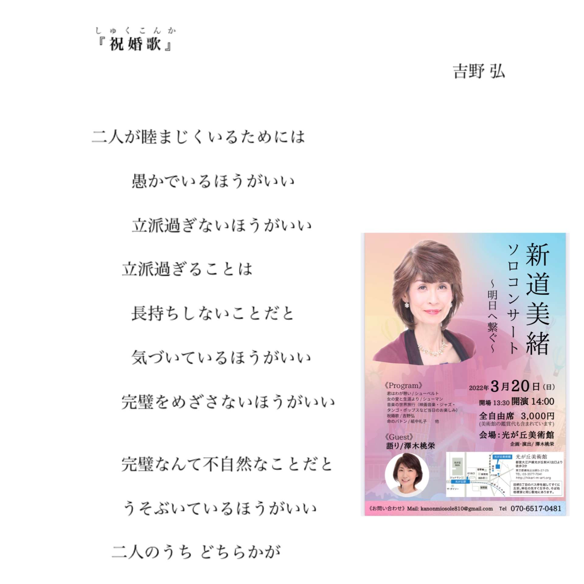 今回は、30年来の友人である澤木桃栄さんが企画演出をしてくれているのですが、彼女が朗読をしてくれることになっている、吉野弘さんの「祝婚歌」。詩が歌になるように作曲して、と言われ取り組むも、難しくて全く出来ず…この詩に作曲するにあたり、JASRACに連絡を取り、ご遺族の方ともお話しさせていただき了解をいただいたこともあり、なんとか形にしたいと奮闘の日々…桃さんのアドバイスをいただきつつ、やっと今日、完成❣️