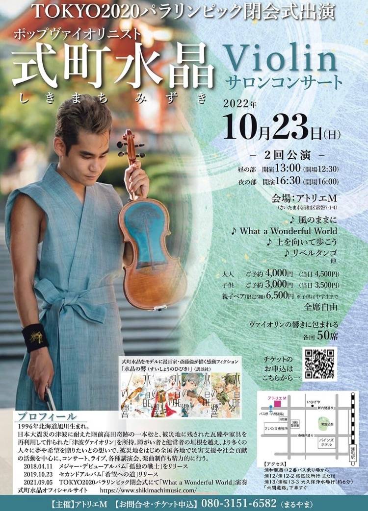 そして、いずみさんがチラシデザイン作成を通して繋がられたという式町水晶さん。過日のパラリンピックで演奏された方ですが、脳性まひを乗り越えてバイオリニストへ。壮絶な人生を感じさせない、底抜けに明るい演奏とトーク。娘と同世代の若い方ですが、演奏家の在り方を学ぶ思いでした。