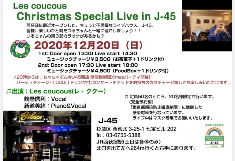 クリスマスライブのお知らせ 2020/11/08 Les coucous(レ・ククー)の二人で、西荻窪のJ-45にてクリスマスライブを行ないます。 12/20(日)14:30〜 18:00〜 ♫出演:Les coucous(レ・ククー) 鶴巻信利:Vocal 新道美緒:Piano&Vocal ♫ 定員50名のところ、20名様限定で行います。(完全予約制) 「東京都感染防止徹底制限」に準拠した感染対策を行なっています。 ライブ中はマスク着用でお願いいたします。